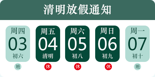 隨著清明節(jié)的腳步逐漸臨近,為了讓大家能夠更好地緬懷先人、與家人共度美好時光,公司決定按照國家法定假日安排,結(jié)合我們的實際情況,進行如下放假安排